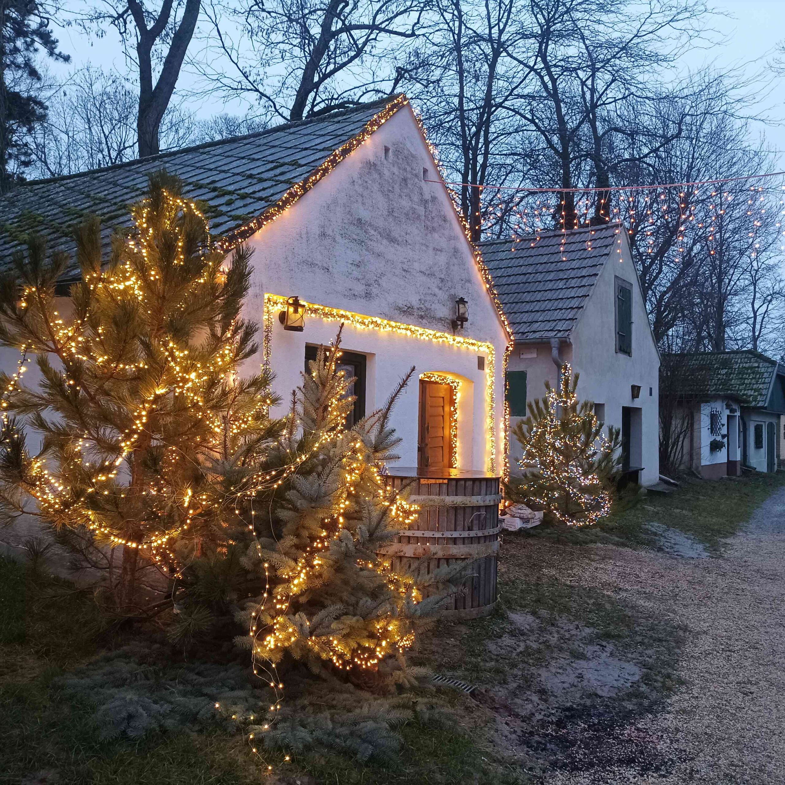 Einige Weinkeller am Kellerberg in Mannersdorf an der March sind in der Vorweihnachtszeit wieder festlich geschmückt und stahlen in hellem Glanz.