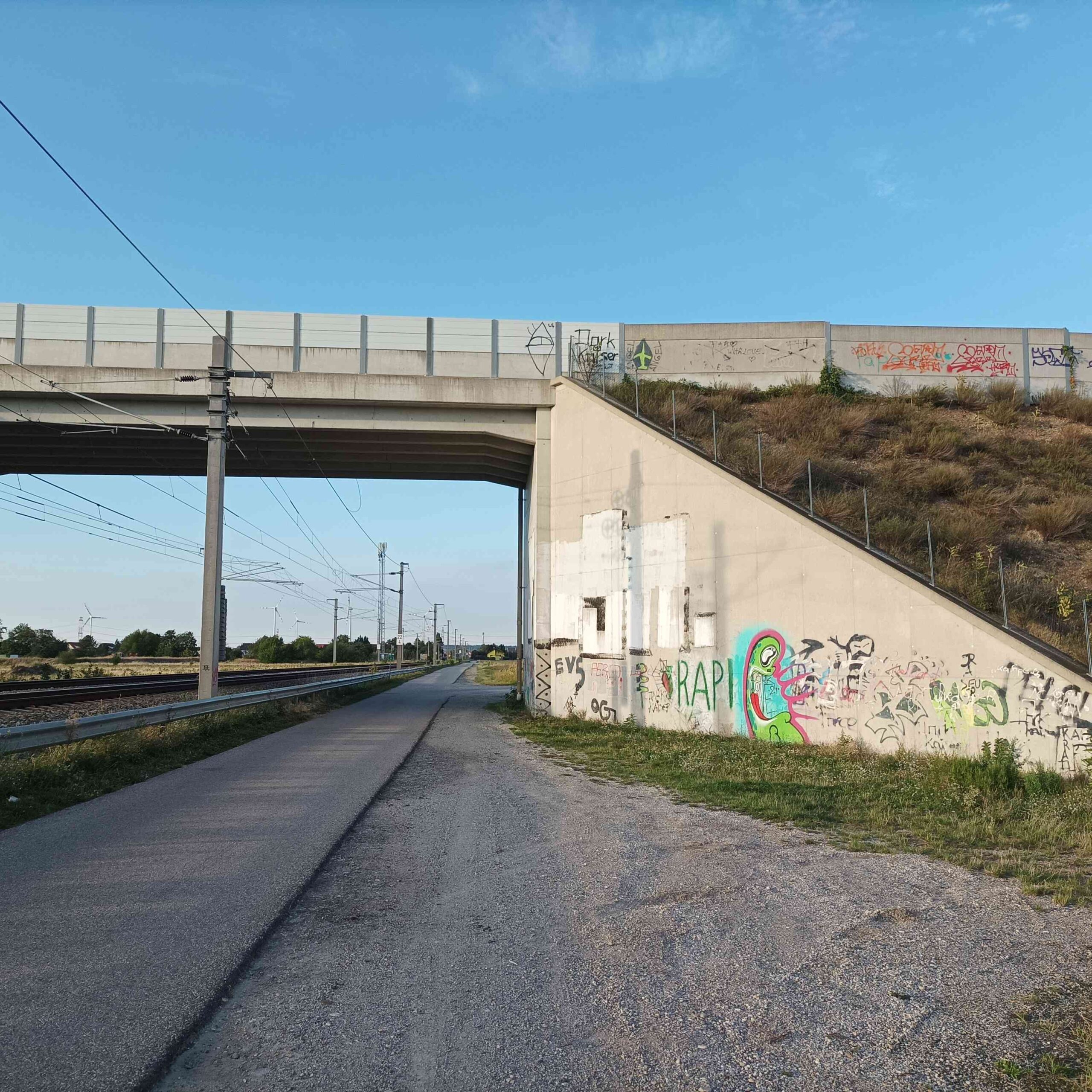 Graffiti an der Brückenmauer neben dem Radweg zwischen Kapellerfeld und Seyring.
