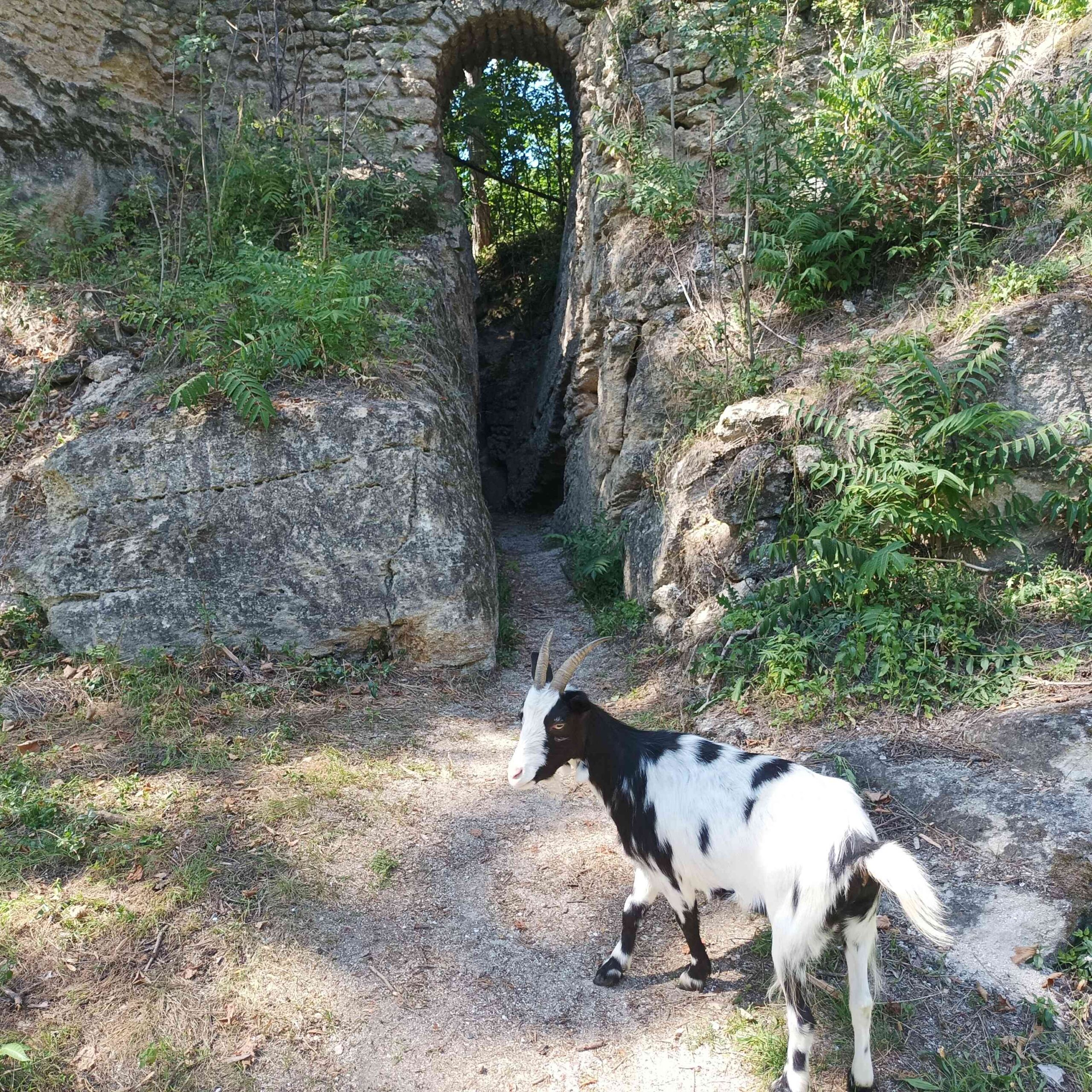 Beim Aufstieg über die schmalen Wege öffnen sich immer wieder weite Ausblicke über die umliegende Landschaft. Die trockenen Wiesen und Felsen bieten Lebensraum für seltene Pflanzen und Tiere. Während unseres Besuchs wurde die Stille plötzlich durch Meckern unterbrochen: Eine Gruppe Ziegen kam neugierig auf uns zu, offenbar an Wanderern gewöhnt und völlig unbeeindruckt von unserer Überraschung. Für einen Moment gehörten wir ganz selbstverständlich zu ihrer Welt.